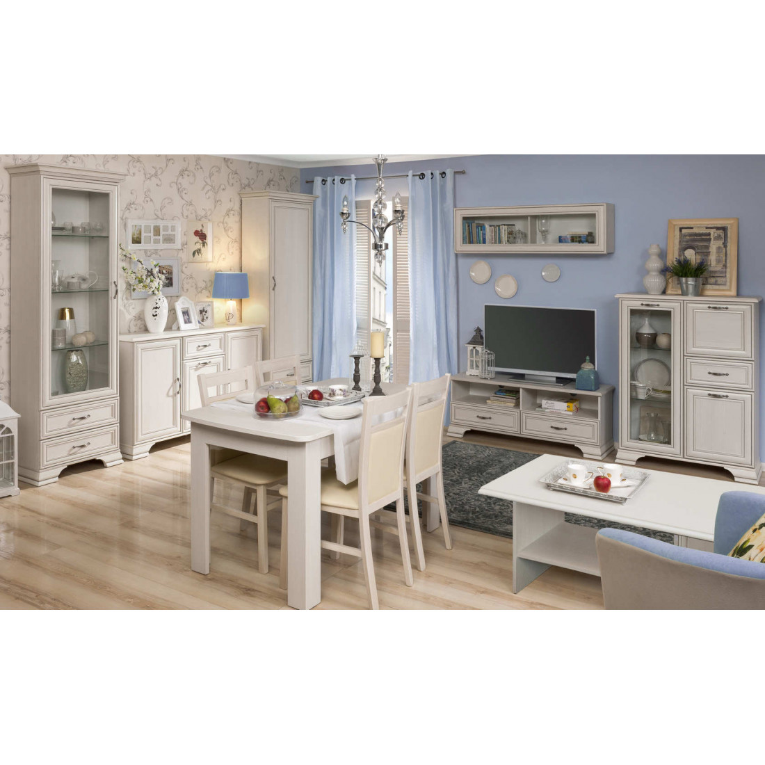 Гостиная Тиффани - это классика, которая всегда остается модной и стильной. Сочетание светлого оттенка с древесной структурой, нежных фасадов, обрамленных изящными планками с патиной и качественных металлических ручек создадут атмосферу тепла и уюта, а возможность использования подсветки делает эту коллекцию особенно привлекательной. Основное достоинство TIFFANY - эстетическая функциональность, которая роскошно дополнит различный по назначению интерьер.