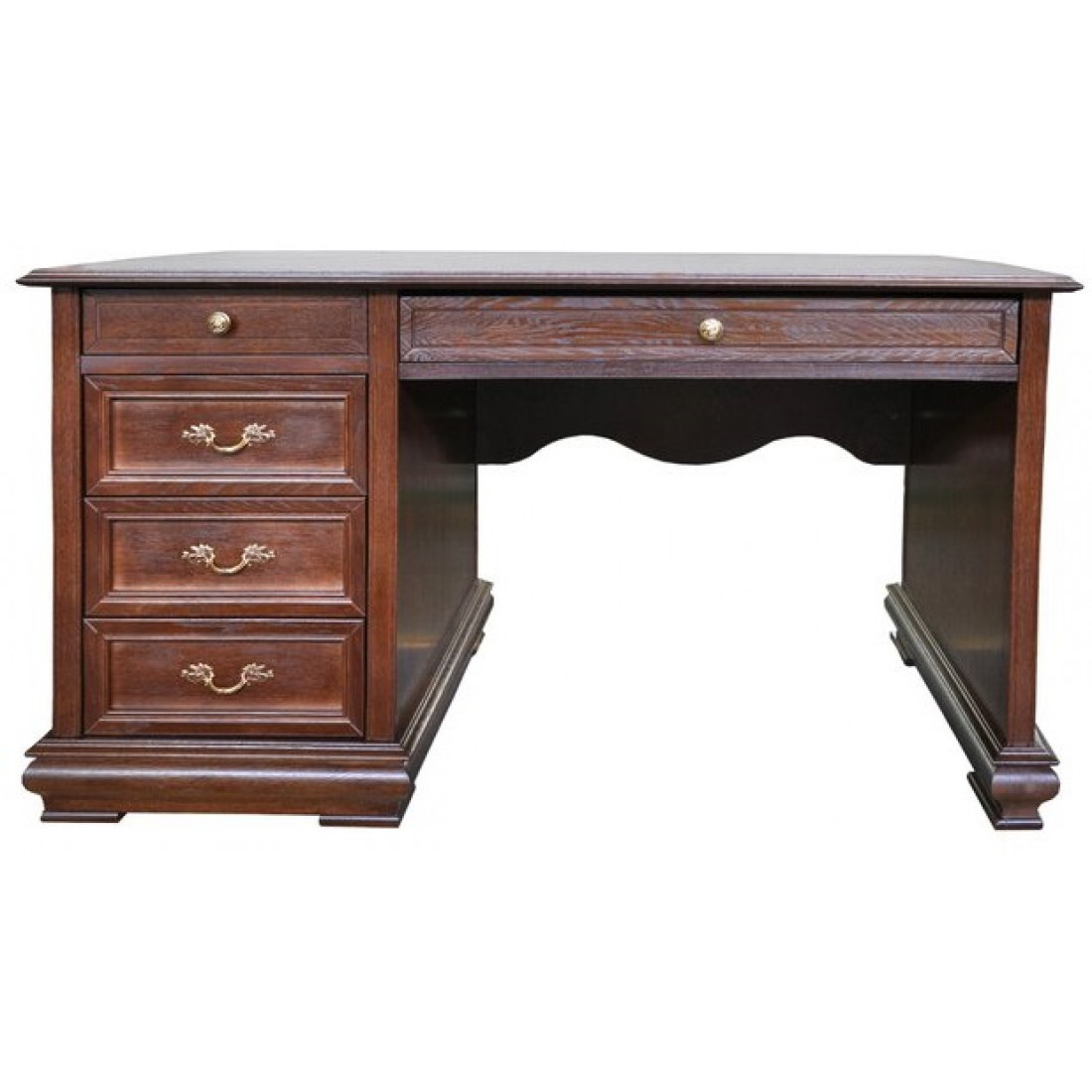 Возможно изготовление тумбы справа и слева. Настоящей изюминкой домашнего кабинета может стать письменный стол из коллекции "Оскар". Натуральная фактура дуба, тонкие оттенки цветовой гаммы и фурнитура из золота и черненного серебра придают столу поистине аристократичный вид. На представительной дубовой столешнице гармонично смотрятся и современные гаджеты и раритетные письменные принадлежности. Дно ящиков обращает на себя внимание великолепной велюровой отделкой.